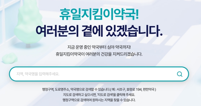 휴일지킴이약국 사이트에서는 주말, 공휴일 운영되는 약국과 연중무휴 약국, 심야약국을 지역별로 검색할 수 있습니다.