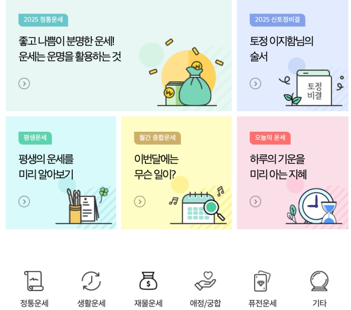 이곳에서는 오늘의 운세, 토정비결, 타로, 정통운세, 궁합 등의 다양한 운세 콘텐츠를 무료로 확인 할 수 있습니다.