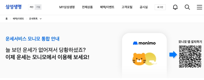 삼성생명은 '모니모' 앱을 통해 무료 운세 서비스를 제공하고 있습니다. 아래에서 모니모 앱을 설치하신 후 하단의 '마이' 메뉴를 선택하고 '생명' 탭을 선택한다면 '운세' 메뉴를 이용할 수 있습니다.