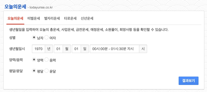 오늘의 운세라는 사이트는 운세만을 전문적으로 다루고 있는 플랫폼입니다. 사업운, 애정운, 금전운 등의 다양한 운세를 확인할 수 있습니다. 생년월일 입력 후 원하는 운세를 선택해서 운세를 보실 수 있습니다.