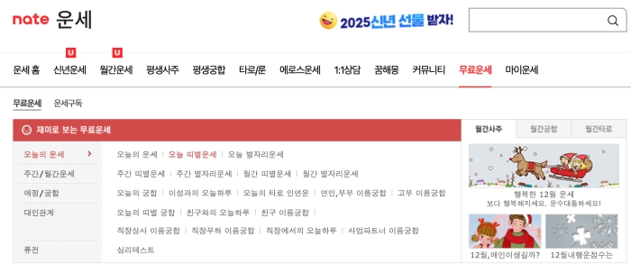 네이트에서도 다양한 무료 운세 서비스를 제공하고 있습니다. 네이트 메인 화면의 운세 메뉴에서 간단히 운세를 확인 할 수 있습니다.