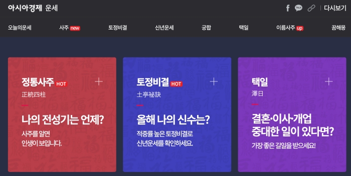 아시아경제 사이트에서는 무료 토정비결, 작명, 이름풀이, 무료 궁합, 재물운, 결혼택일, 이사방향, 꿈해몽 등의 다양한 운세 서비스를 제공하고 있습니다.
