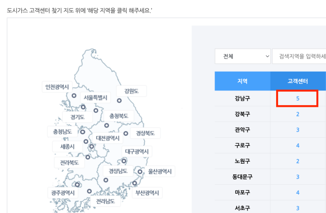 해당 지역을 지도에서 선택해 주신 후 고객센터 아래 숫자를 누르면 고객센터 전화번호를 알 수 있습니다.