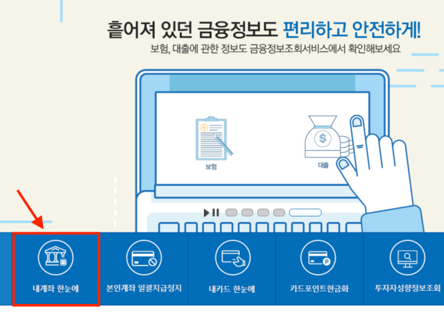 계좌정보통합관리서비스 사이트 ( www.payinfo.or.kr )에 방문하시고 내 계좌한눈에를 클릭