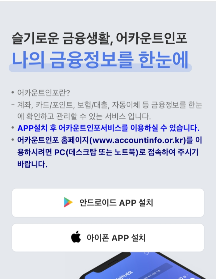 계좌정보 통합 관리 서비스를 pc 환경에서 이용할 수 없다면 모바일 앱을 다운로드 받아 조회해 보시기 바랍니다.