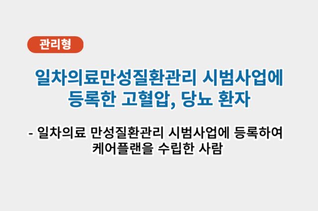 관리형의 경우는 일차의료만성질환관리 시범사업에 등록이 된 고혈압, 당뇨 환자를 대상으로 합니다.