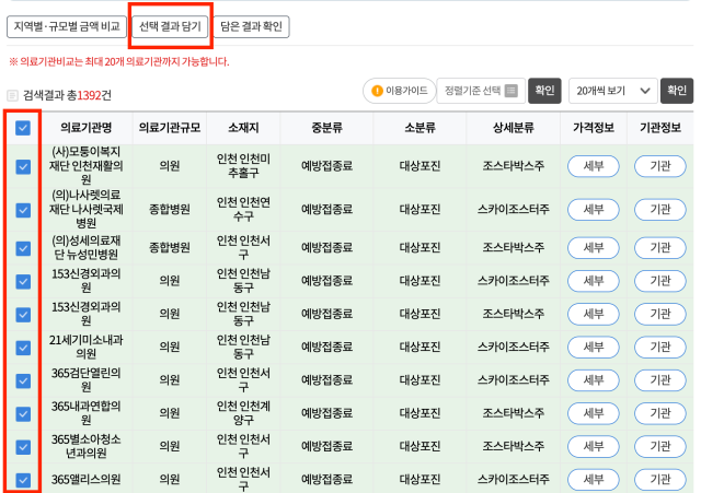 이때, 비교해 보고 싶은 병원을 전부 선택해 주신 후 선택 결과 담기 > 담은 결과 확인 눌러주시면 선택한 병원을 전부 비교해서 볼 수 있습니다.(20개까지 선택 가능)