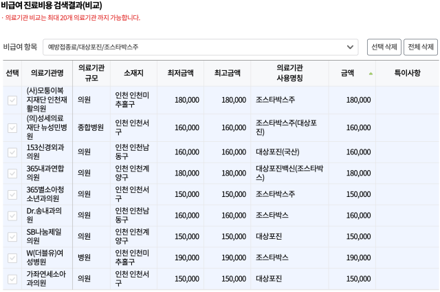 6. 아래와 같이 선택한 병원들의 가격을 한눈에 볼 수 있습니다.