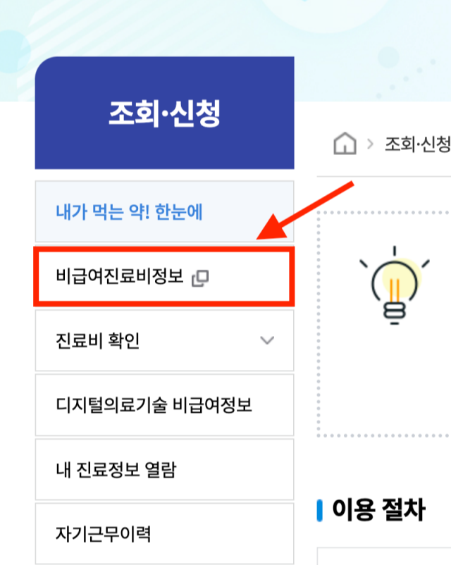 2. 조회, 신청 메뉴의 비급여 진료비 정보를 선택해 주세요.