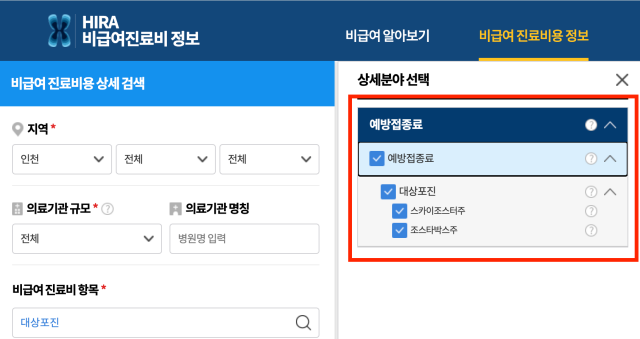 4. 상세분야 선택의 예방접종료를 선택해 주세요. 전체 선택!