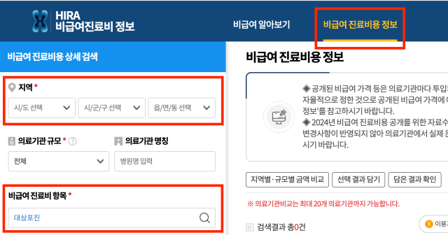 3. 메뉴 중 비급여 진료비용 정보를 선택해 주신 후, 지역선택 > 비급여 진료비 항목에 대상포진을 검색해 주세요.