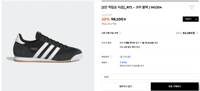 아디다스 R71은 다소 생소한 제품명인데 이번에 아디다스 오리지널스에서 나온 신제품이다. 지금 29cm에서 아디다스 런칭 이벤트로 10% 할인 중이고 29cm에서 지급해 주는 쿠폰 등 적용해서 구매 가능한 가격은 83,385원! 여기에 1만 원 적립금도 지급해 준다고 한다.