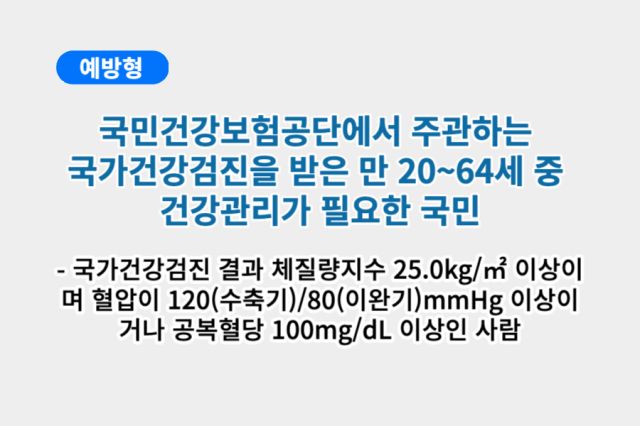 예방형의 참여 기준은 아래와 같습니다. 국가건강검진을 실시한 만 20세 ~ 64세 국민 중 혈압이나 공복혈당이 일정기준 이상으로 높아 건강관리가 필요한 국민을 대상으로 합니다.