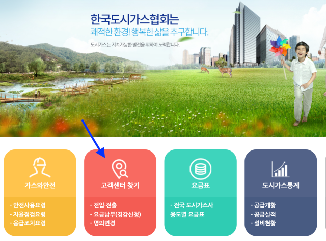 한국도시가스 협회 > 고객센터 찾기 클릭 고객센터를 통해 요금납부(경감신청)나 명의변경 등의 업무도 가능합니다.