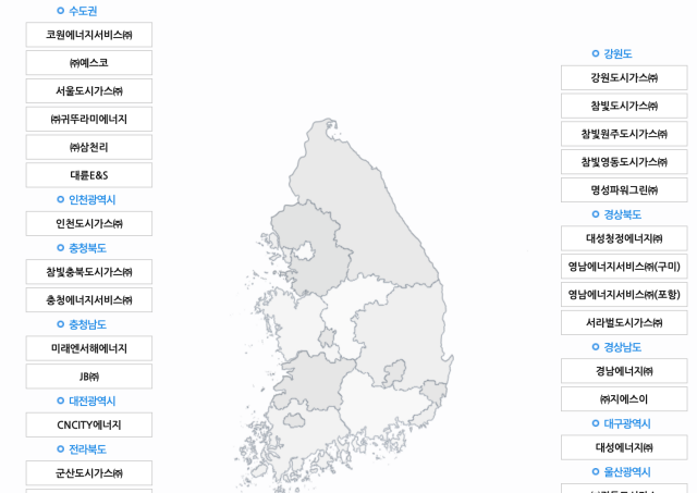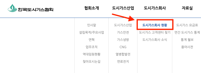 한국 도시가스 협회를 통한 조회 방법입니다. 한국도시가스협회 사이트 > 도시가스 회사 > 도시가스회사 현황
