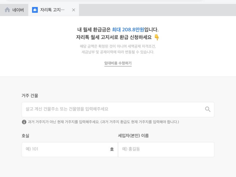2. 다음화면에서 월세환급 및 자리톡 시작 버튼을 눌러주고 임대유형 및 비용을 입력하고 금액확인하기를 눌러줍니다.